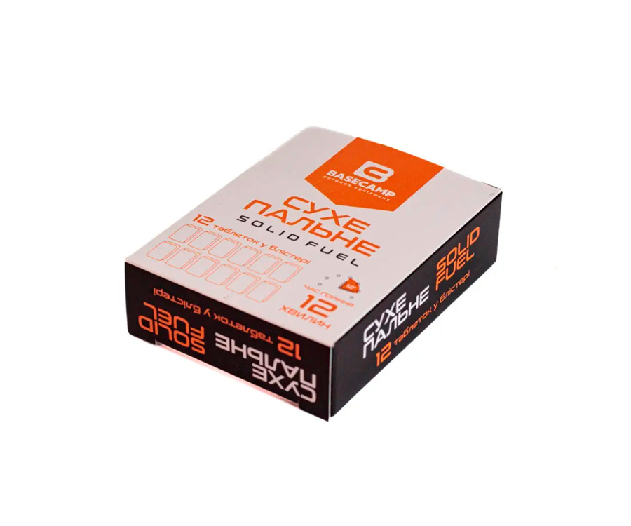 Сухе пальне Base Camp призначене для швидкого та зручного розпалювання багать, камінів, печей та мангалів. Може служити самостійним засобом підігріву, а також швидкого приготування їжі в похідних умовах. Таблетка горить без диму та запаху, легко запалюється звичайним сірником.