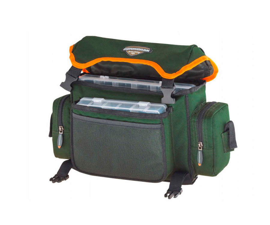 Риболовна сумка Cormoran Lure Bag дуже зручна й компактна, але водночас вміщує все необхідне для успішної риболовлі. Сумка комплектується двома коробками для приманок, а також має велику фронтальну кишеню і дві місткі бічні кишені, на яких розміщено тримачі для інструменту. Дно сумки виготовлено з міцного PVC, захищаючи дно сумки від вологи, також цей матеріал легко чистити від забруднень. Для транспортування сумки є дві міцні ручки та широкий наплічний ремінь.