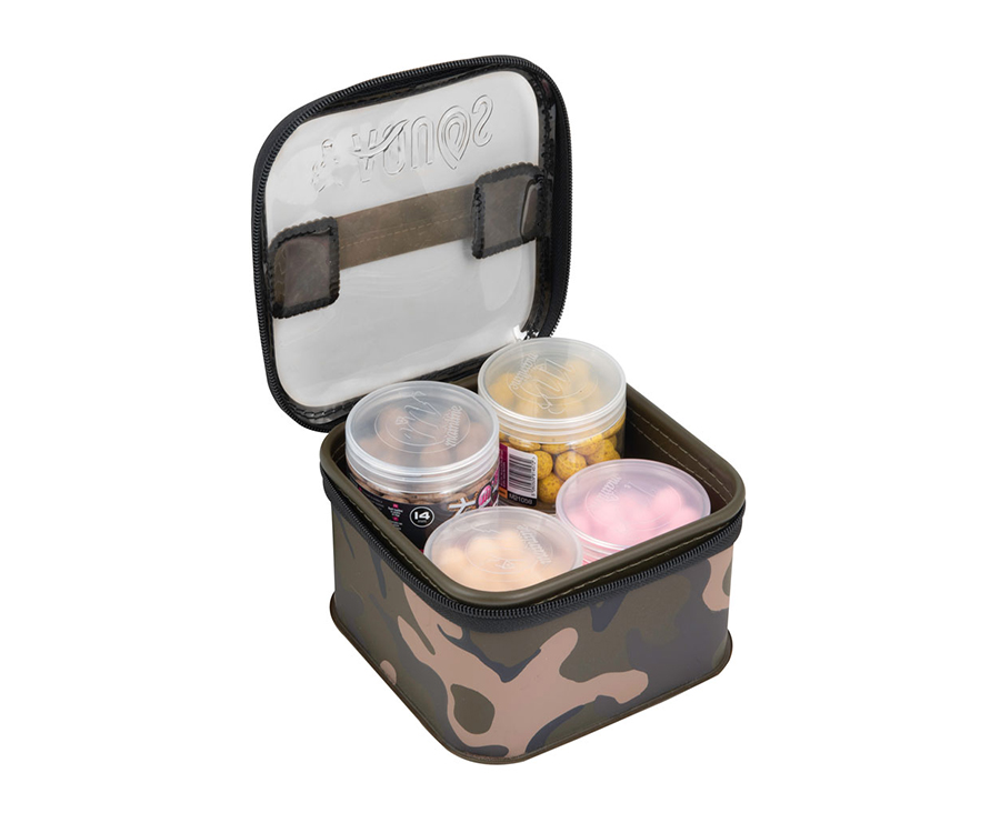 FOX Aquos Camo Bait Storage – серія водонепроникних і стійких до зношування сумок для зберігання приманок, які виготовлено з EVA матеріалу. Aquos Camo Bait Storage випускаються у трьох розмірах – M, M +, L.