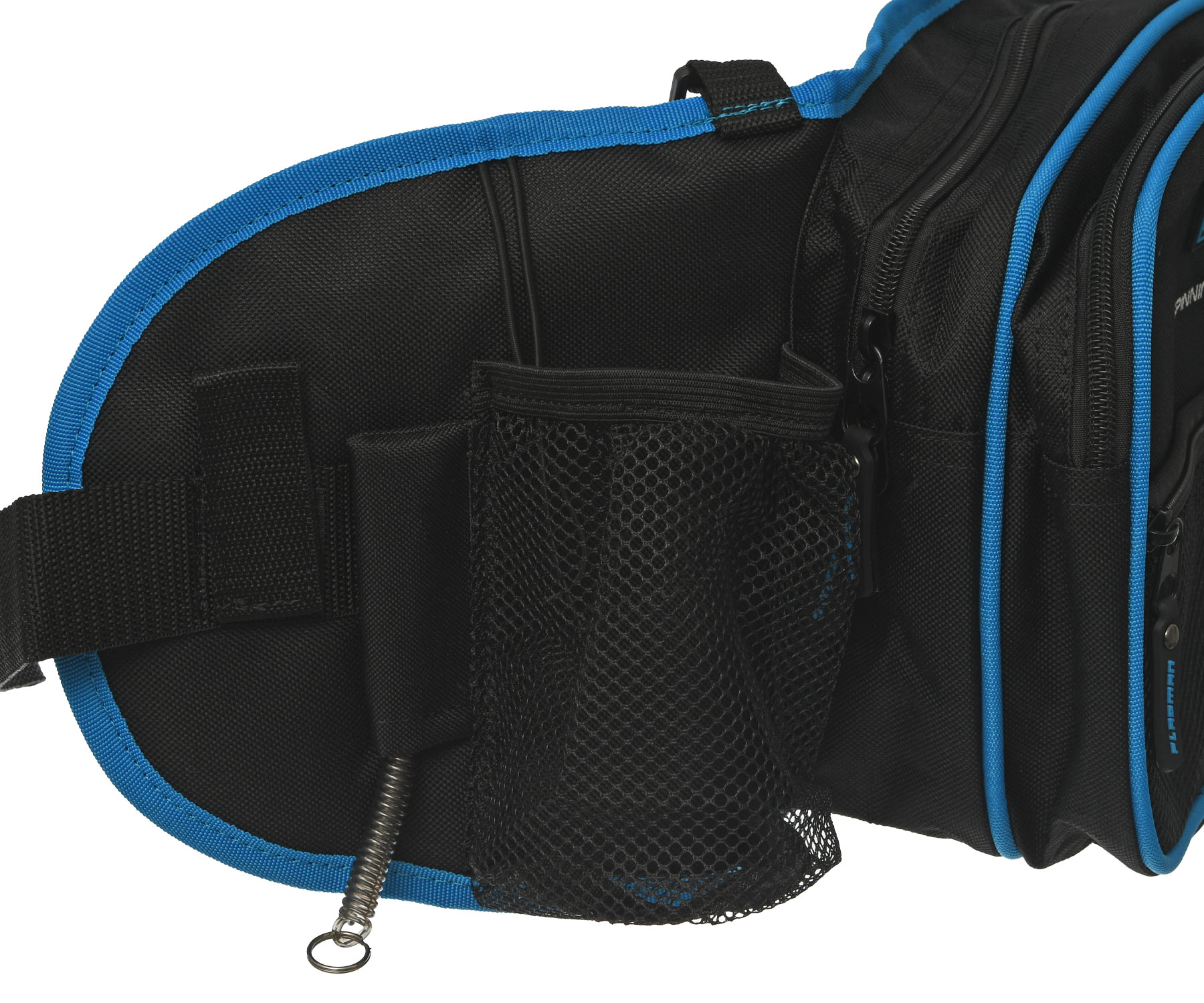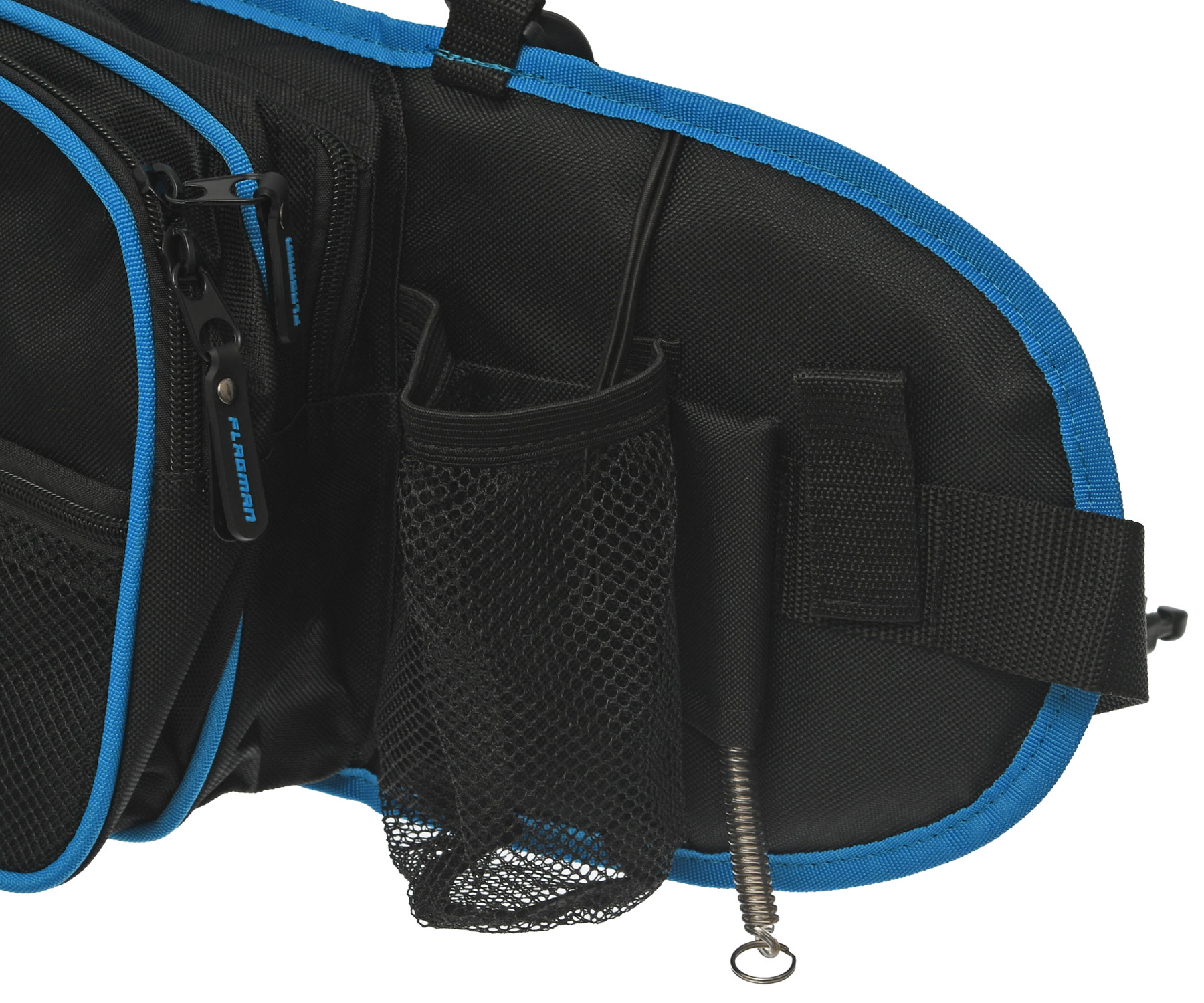 Сумка Flagman Spin Bag 15 – зручна та містка поясна спінінгова сумка для зберігання і транспортування коробок із приманками, рибальського спорядження та іншого приладдя. Виготовлена з міцної зносостійкої тканини Oxford 600D з водовідштовхувальними властивостями. Сумка чудово захищає вміст від водяних бризок і механічних ушкоджень. Модель Flagman Spin Bag 15 має два великих відділення на двосторонніх блискавках, оснащена місткою фронтальною кишенею на блискавці, 2 сітчастими кишенями + 2 витими ретриверами для закріплення інструментів. Для транспортування риболовної сумки Flagman Spin Bag FSB15 використовують поясний ремінь і регульований наплічний ремінь із м'якою накладкою. Розміри: 50х20 см.