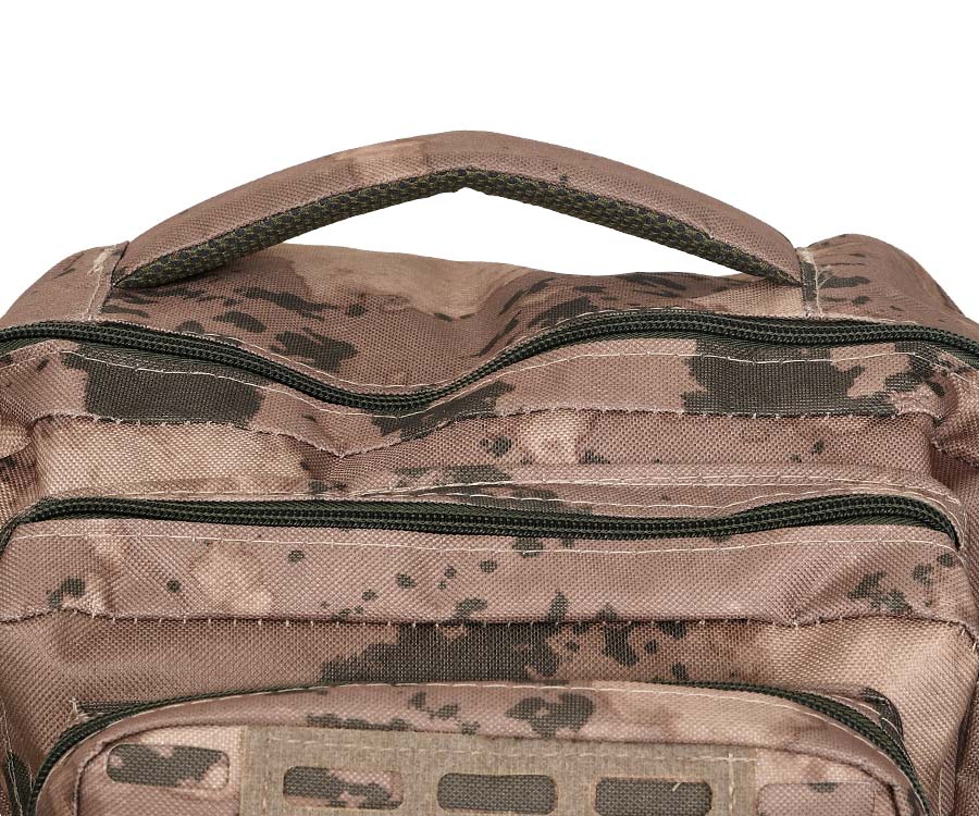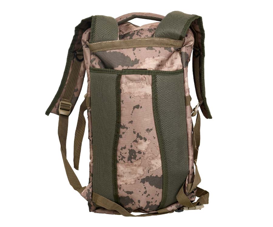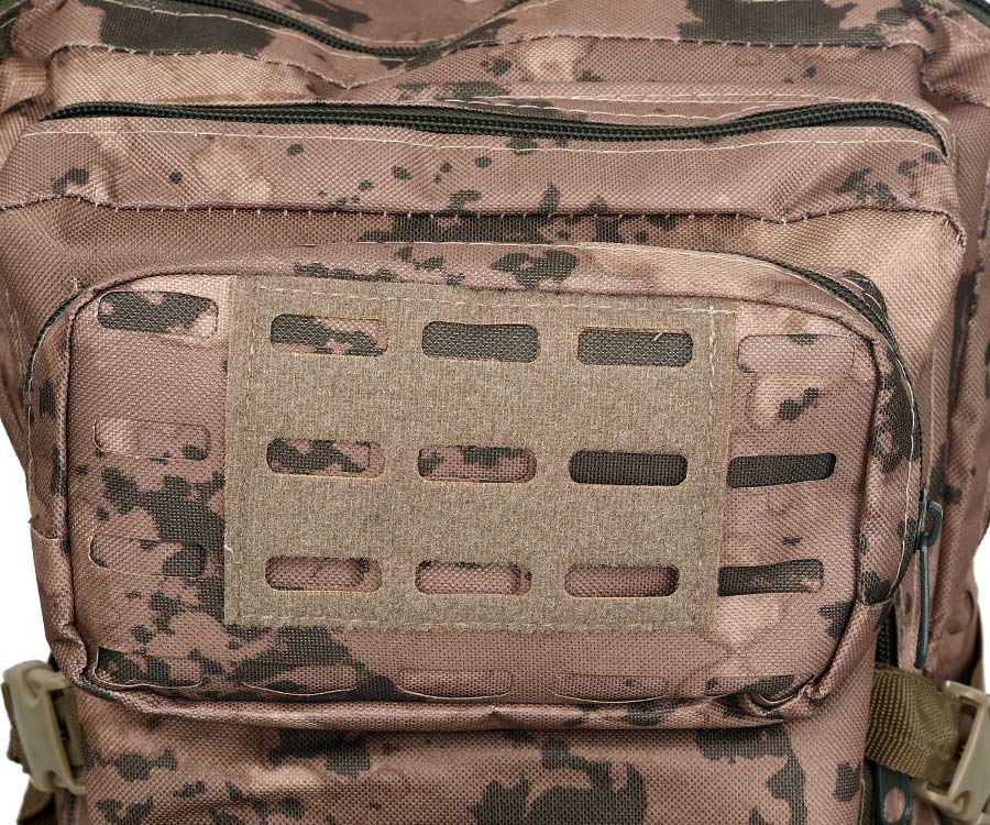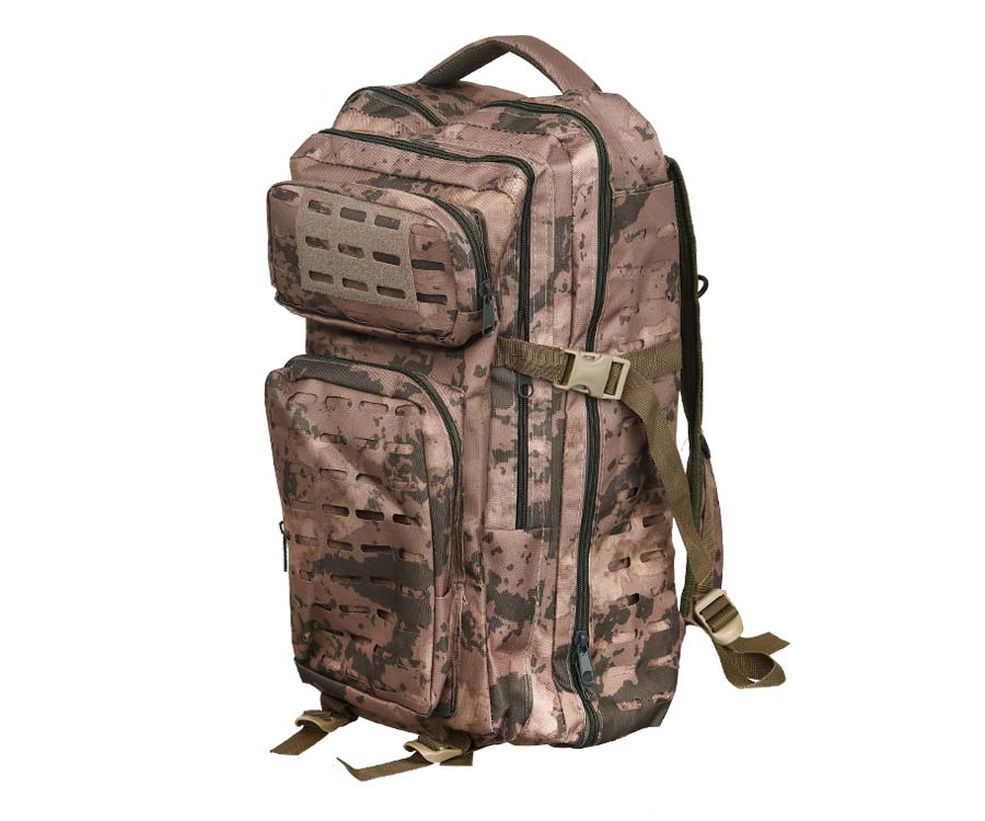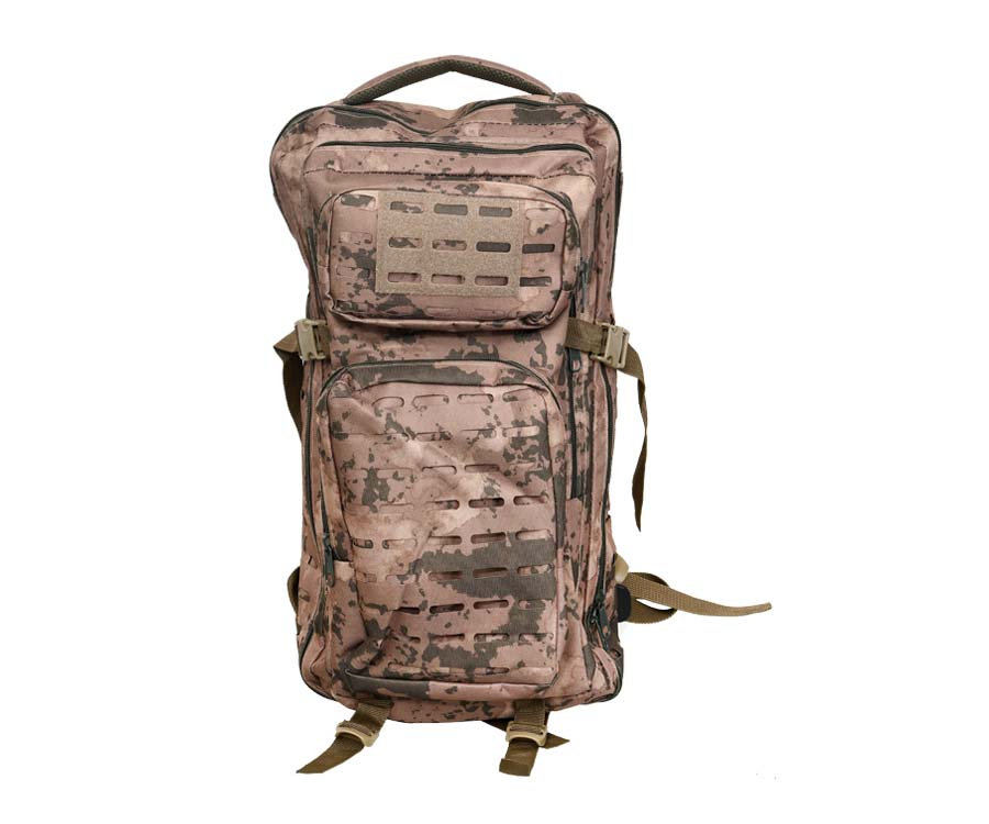 Одноденний тактичний рюкзак, який виготовлено з міцного зносостійкого камуфляжного матеріалу Oxford 600 D. З країв спинки рюкзака розміщено підкладку із сітчастого матеріалу, внутрішню частину плечових лямок також виконано із сітки, завдяки чому покращується циркуляція повітря та знижується потовиділення. Наплічні лямки мають ергономічну форму та регулюються за довжиною. На лямках встановлено чотири D-подібних кільця. Рюкзак має модульну систему, що дозволяє закріплювати додаткове обладнання до передніх відділень та боків. Попереду розташовано два відділення (кишені) для аксесуарів із нашитими на них стрічками-липучками, які дають можливість навішувати на рюкзак додаткове спорядження з інтерфейсом Molle. Два основні відділення – середнє та велике – дають змогу максимально зручно розмістити необхідні речі, раціонально використовуючи внутрішній простір рюкзака. З боків та знизу передбачено регульовані компресійні ремені для збільшення/зменшення місткості рюкзака. Крім того, є регульований поясний ремінь із защібкою, а у верхній частині – ручка для перенесення.