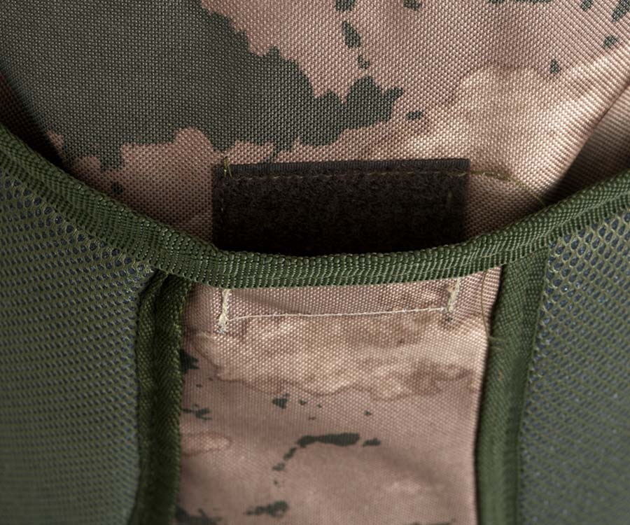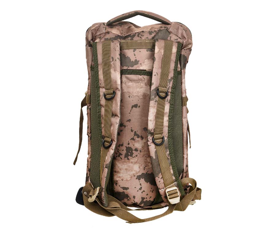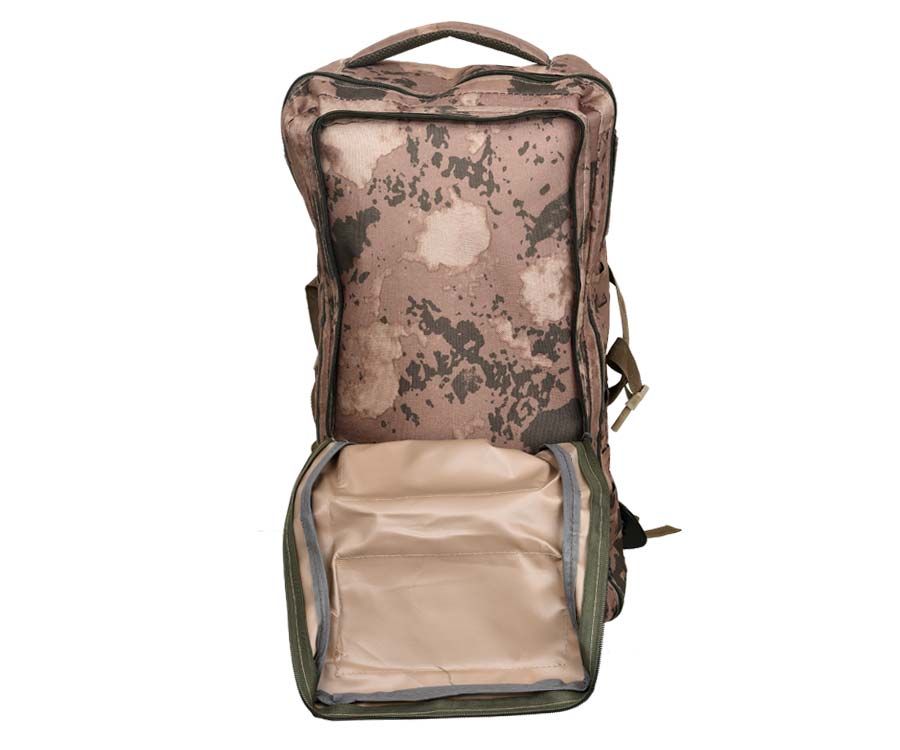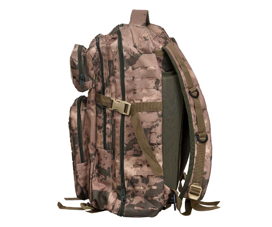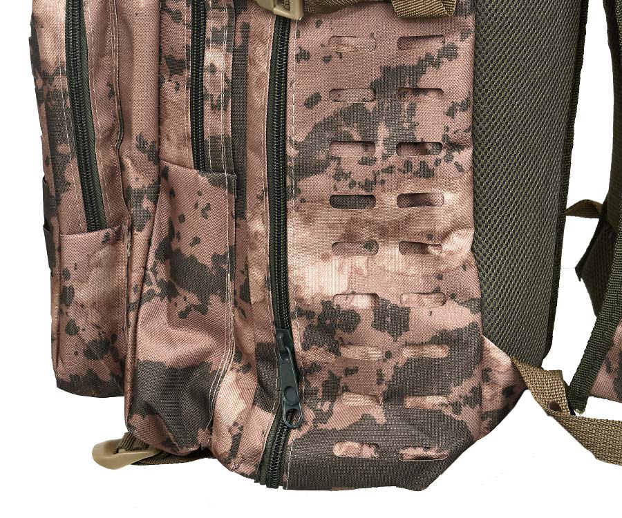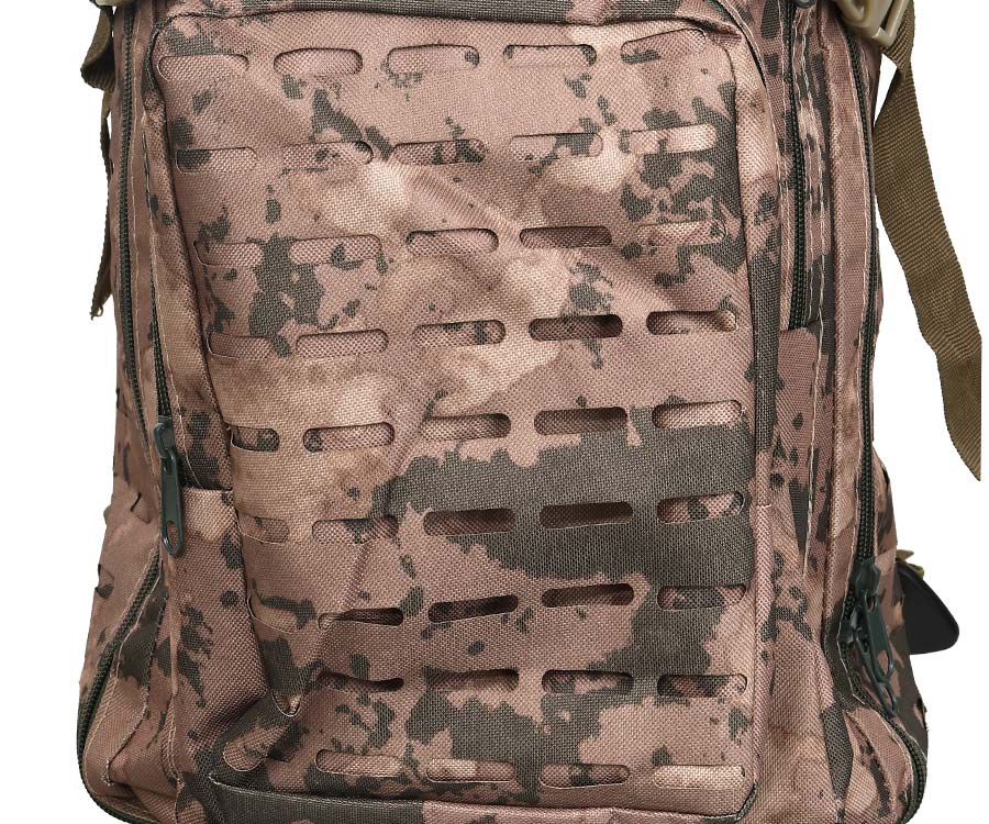 Одноденний тактичний рюкзак, який виготовлено з міцного зносостійкого камуфляжного матеріалу Oxford 600 D. З країв спинки рюкзака розміщено підкладку із сітчастого матеріалу, внутрішню частину плечових лямок також виконано із сітки, завдяки чому покращується циркуляція повітря та знижується потовиділення. Наплічні лямки мають ергономічну форму та регулюються за довжиною. На лямках встановлено чотири D-подібних кільця. Рюкзак має модульну систему, що дозволяє закріплювати додаткове обладнання до передніх відділень та боків. Попереду розташовано два відділення (кишені) для аксесуарів із нашитими на них стрічками-липучками, які дають можливість навішувати на рюкзак додаткове спорядження з інтерфейсом Molle. Два основні відділення – середнє та велике – дають змогу максимально зручно розмістити необхідні речі, раціонально використовуючи внутрішній простір рюкзака. З боків та знизу передбачено регульовані компресійні ремені для збільшення/зменшення місткості рюкзака. Крім того, є регульований поясний ремінь із защібкою, а у верхній частині – ручка для перенесення.