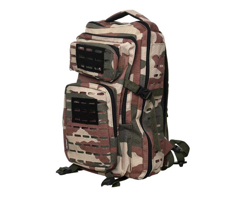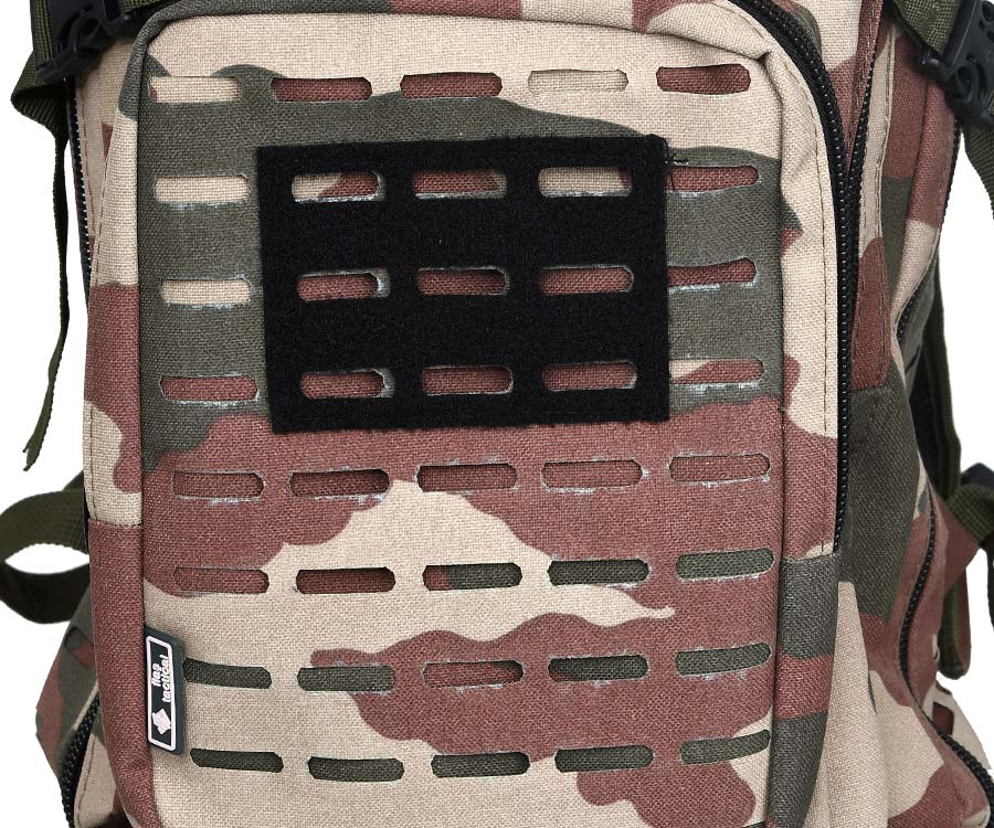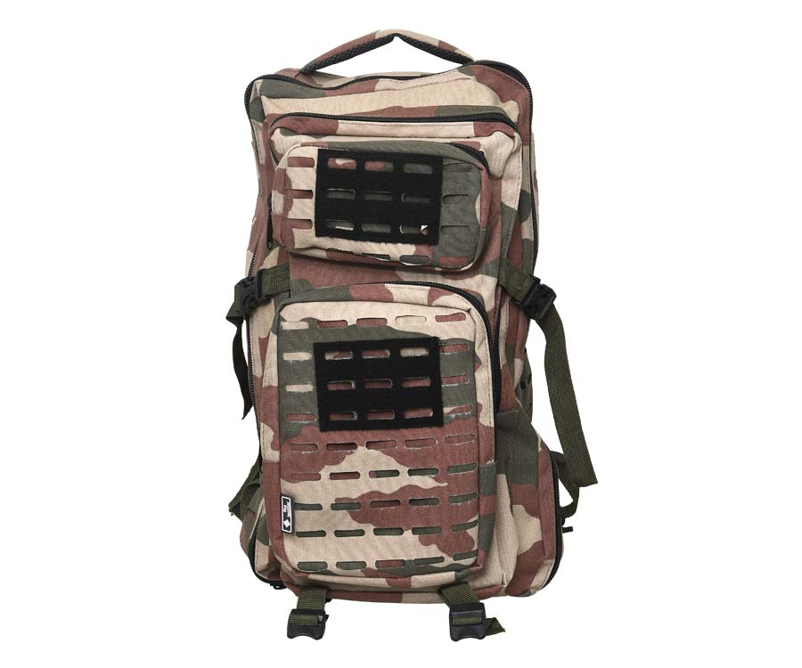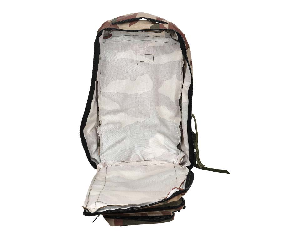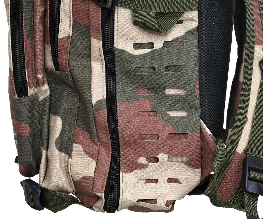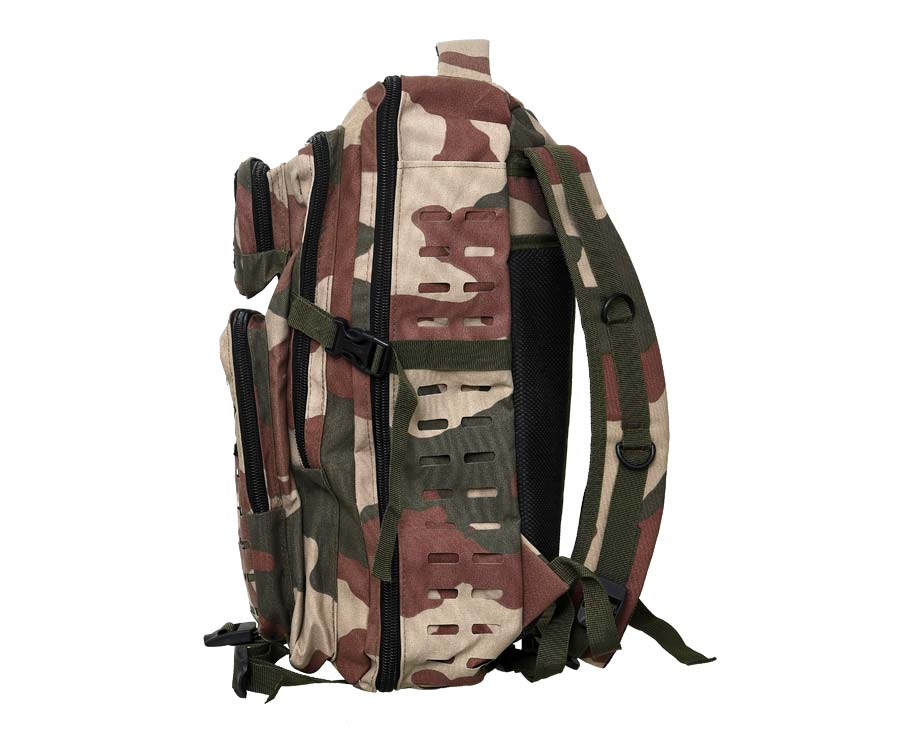 Одноденний тактичний рюкзак, який виготовлено з міцного зносостійкого камуфляжного матеріалу Oxford 600 D. З країв спинки рюкзака розміщено підкладку із сітчастого матеріалу, внутрішню частину плечових лямок також виконано із сітки, завдяки чому покращується циркуляція повітря та знижується потовиділення. Наплічні лямки мають ергономічну форму та регулюються за довжиною. На лямках встановлено чотири D-подібних кільця. Рюкзак має модульну систему, що дозволяє закріплювати додаткове обладнання до передніх відділень та боків. Попереду розташовано два відділення (кишені) для аксесуарів із нашитими на них стрічками-липучками, які дають можливість навішувати на рюкзак додаткове спорядження з інтерфейсом Molle. Два основні відділення – середнє та велике – дають змогу максимально зручно розмістити необхідні речі, раціонально використовуючи внутрішній простір рюкзака. З боків та знизу передбачено регульовані компресійні ремені для збільшення/зменшення місткості рюкзака. Крім того, є регульований поясний ремінь із защібкою, а у верхній частині – ручка для перенесення.
