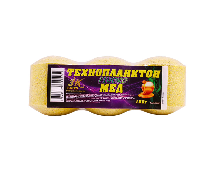 Технопланктон Fluoro(мед) ТМ 3KBaits — це брикети класичної циліндричної форми, які використовуються як підгодівля для ловлі великої білої риби, зокрема товстолоба, коропа і амура. Технопланктон складається з щільно спресованої дрібної поживної суміші і при попаданні у воду починає розчинятися, створюючи ефект розпорошення. Хмара технопланктону, що порошить, притягає рибу з великих відстаней і утримує її в зоні ловлі до моменту повного розчинення.