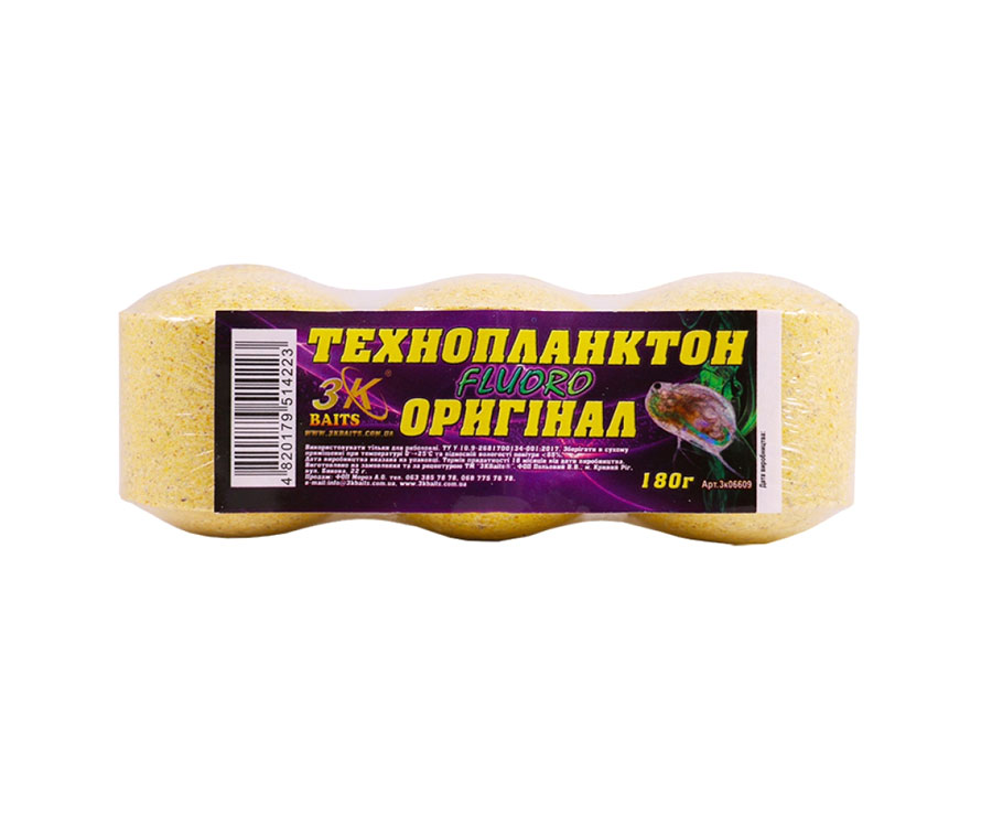 Технопланктон Fluoro(оригінал) ТМ 3KBaits — це брикети класичної циліндричної форми, які використовуються як підгодівля для ловлі великої білої риби, зокрема товстолоба, коропа і амура. Технопланктон складається з щільно спресованої дрібної поживної суміші і при попаданні у воду починає розчинятися, створюючи ефект розпорошення. Хмара технопланктону, що порошить, притягає рибу з великих відстаней і утримує її в зоні ловлі до моменту повного розчинення.