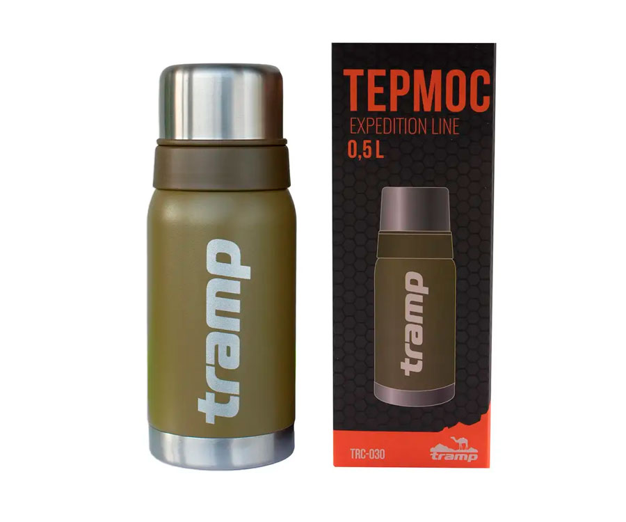 Термос Tramp TRC-030 об'ємом 0,5 л серії Tramp Classic - найпопулярніший в Україні серед туристів, мисливців, рибаків та військових надійний термос. Термос йде у комплекті з глухим корком з каналами для наливання в напівзакритому стані. Така конструкція дозволяє наливати рідину, не відкручуючи корок повністю, що значно зменшує втрати тепла при використанні. Завдяки подвійній стінці довго зберігає температуру як гарячих, так і холодних напоїв. Виготовлений з легкого й міцного матеріалу. Термос іззовні покрито молотковою фарбою, що забезпечує максимальний захист корпуса від подряпин і сколів.