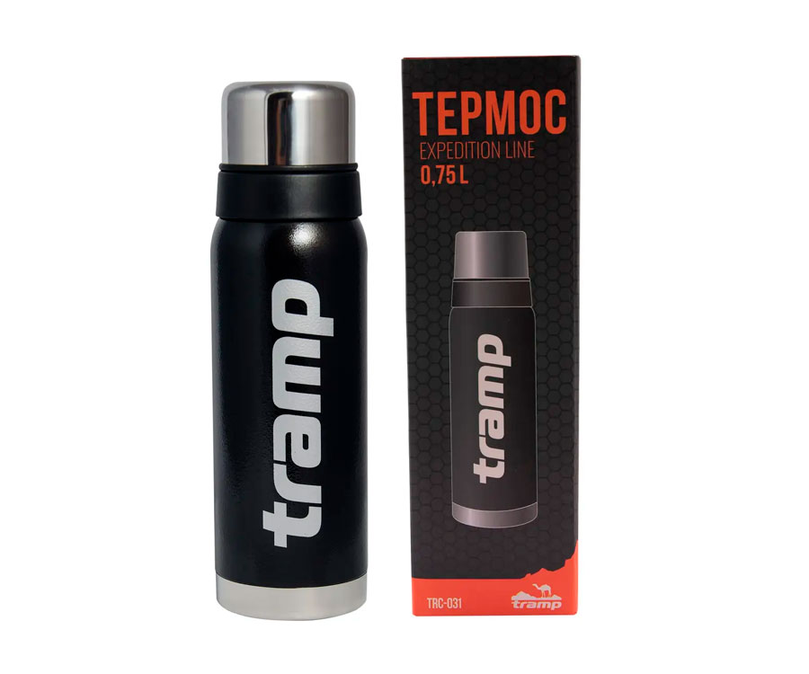 Термос Tramp TRC-031 об'ємом 0,75 л серії Tramp Classic - найпопулярніший в Україні серед туристів, мисливців, рибаків та військових надійний термос. Термос йде у комплекті з глухим корком з каналами для наливання в напівзакритому стані. Така конструкція дозволяє наливати рідину, не відкручуючи корок повністю, що значно зменшує втрати тепла при використанні. Завдяки подвійній стінці довго зберігає температуру як гарячих, так і холодних напоїв. Виготовлений з легкого й міцного матеріалу. Термос іззовні покрито молотковою фарбою, що забезпечує максимальний захист корпуса від подряпин і сколів.