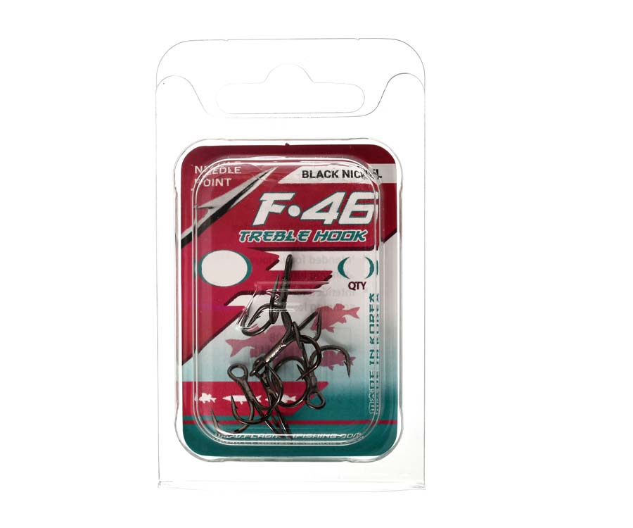 Flagman Treble Hook F-46 – серія класичних потрійних гачків, які виготовлено в Кореї. Трійники Flagman F-46 мають найвищу якість і відповідають найжорсткішим вимогам сучасної риболовлі. Для цих гачків характерні коротка цівка, округлий загин, високоякісне антикорозійне покриття темного кольору, а також надгостре жало із заточенням Needle Point, яке гарантує надійне засікання риби, що клюнула. Форма Flagman Treble Hook F-46, пронизливі жала й чіпкі борідки зводять нанівець можливість сходу риби під час виважування. Розмірний ряд гачків дає змогу легко підібрати оптимальну модель залежно від типу снасті, розмірів приманки або наживки, а також величини передбачуваної здобичі.
