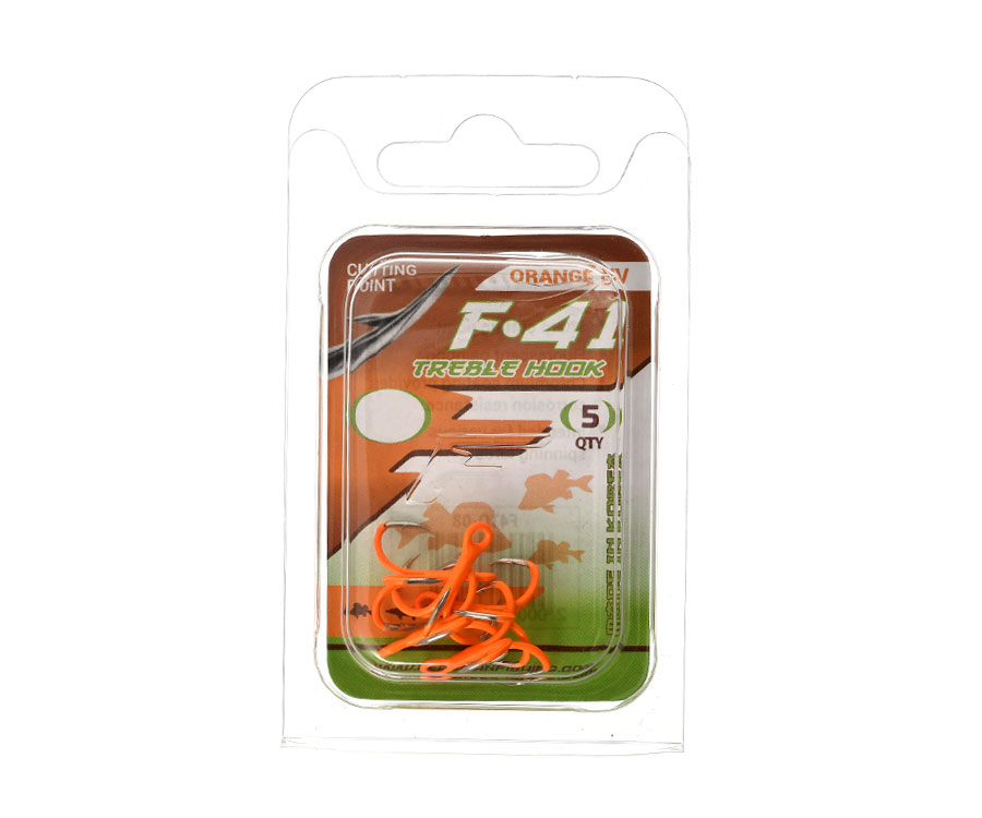 Flagman Treble Hook F-41 Orange UF – серія класичних потрійних гачків, які виготовлено в Кореї. Трійники Flagman F-41 мають найвищу якість і відповідають найжорсткішим вимогам сучасної риболовлі. Для цих гачків характерні коротка цівка, округлий загин, високоякісне антикорозійне покриття (хромування), флуоресцентне фарбування, що світиться в ультрафіолеті, а також загнуте всередину надгостре жало із заточенням Needle Point, яке гарантує надійне засікання риби. Форма Flagman Treble Hook F-41, пронизливі жала й чіпкі борідки зводять нанівець можливість сходу риби під час виважування. Розмірний ряд гачків дає змогу легко підібрати оптимальну модель практично під будь-яку спінінгову приманку.