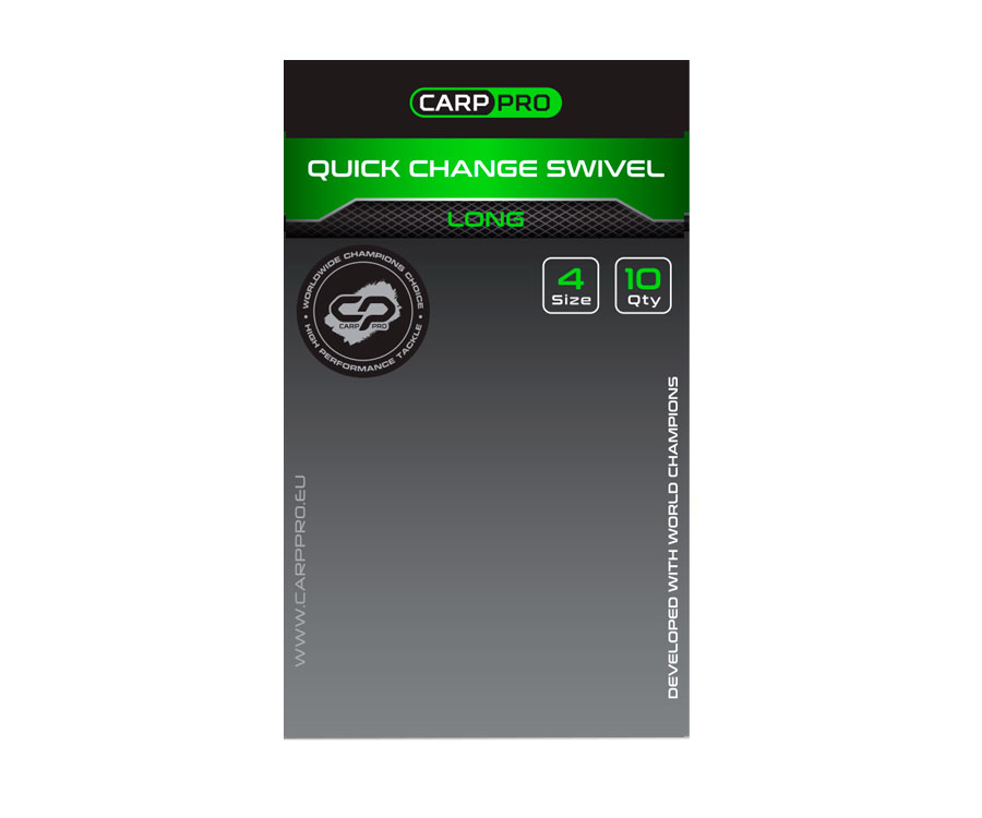 Carp Pro Long – вертлюг «швидкознімний» Quick Change, який виготовлено із високоякісної нержавіючої сталі. Його розроблено для фідерних та коропових монтажів, він значно спрощує їхню заміну. Ідеально підходить для використання з оснастками Chod Rig та Helicopter Rig. Може використовуватися для створення монтажів Ronnie Rig та Spinner Rig. Темне матове покриття надійно захищає метал і не допускає появи відблисків, які відлякують рибу.