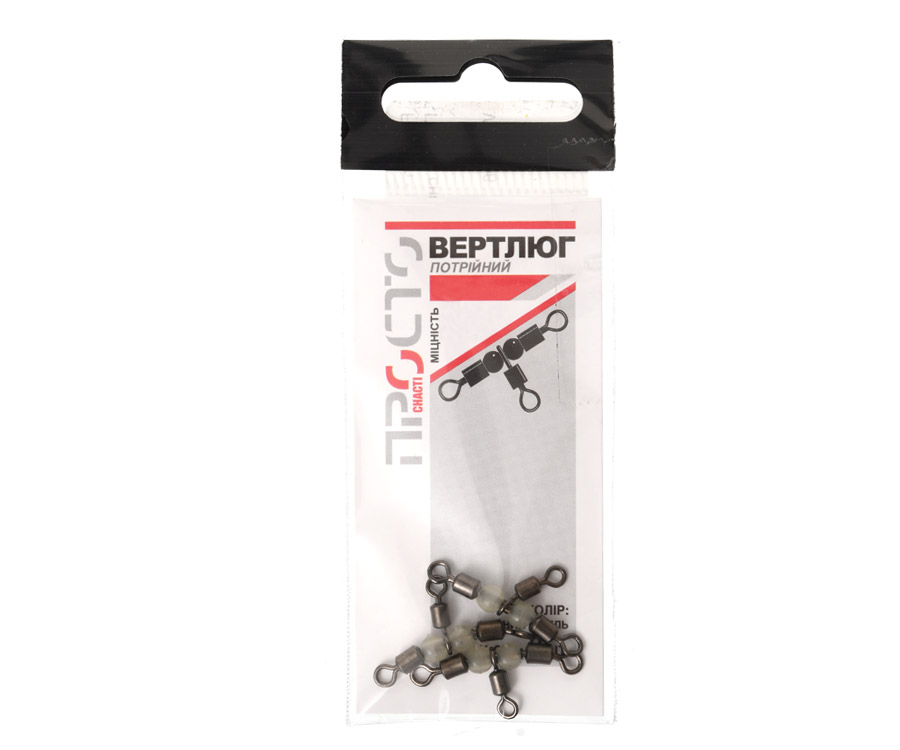 Потрійний вертлюг «Просто снасті» – вертлюг потрійний поворотний із намистинами, який виготовлено з якісної нержавіючої сталі. Призначений для використання в оснастках із повідцем. Запобігає перекручуванню жилки та заплутуванню повідця. Вертлюг потрійний «Просто снасті» є важливим елементом у багатоповідцевих монтажах. Його успішно застосовують для виготовлення оснасток із бічними повідцями або відвідних повідців для ловлі хижої риби. Використовується як у спінінговій, так і в морській або донній ловлі.