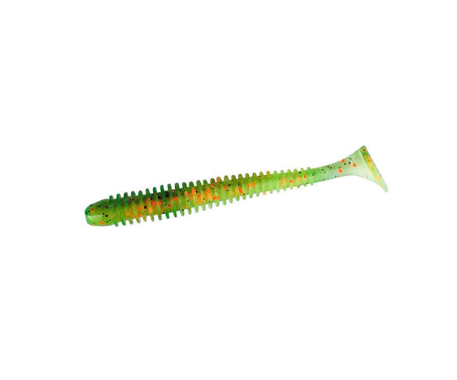 Swing Impact - віброхвіст з подовженим ребристим тілом. Приманка має оригінальну форму оребрення, що робить її гру більш активною. Приманка дуже рухлива, включається в гру вже при повільній проводці. Ребра на тілі приманки створюють додаткові коливання в воді, залучаючи хижака з великої відстані. Swing Impact виготовлений з дуже м'якого «їстівного» силікону, просоченого атрактантом. Swing Impact можна використовувати як на джиг-голівці, так і на шарнірному монтажі з офсетним гачком.