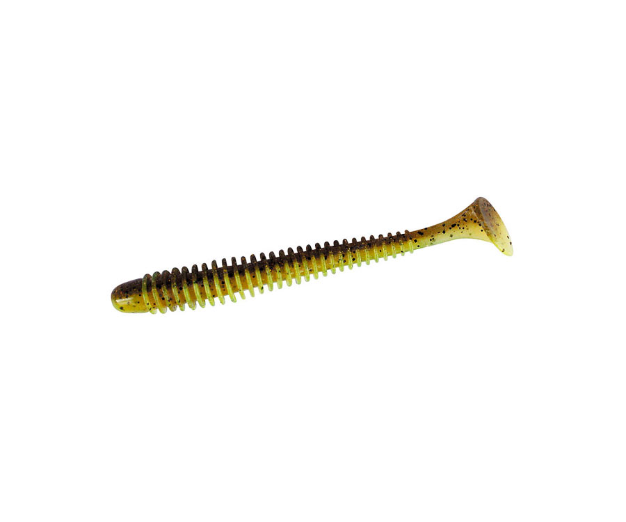 Swing Impact - віброхвіст з подовженим ребристим тілом. Приманка має оригінальну форму оребрення, що робить її гру більш активною. Приманка дуже рухлива, включається в гру вже при повільній проводці. Ребра на тілі приманки створюють додаткові коливання в воді, залучаючи хижака з великої відстані. Swing Impact виготовлений з дуже м'якого «їстівного» силікону, просоченого атрактантом. Віброхвіст відрізняється від менших наявністю прорізі для офсетного гачка. Swing Impact можна використовувати як на джиг-голівці, так і на шарнірному монтажі з офсетним гачком.