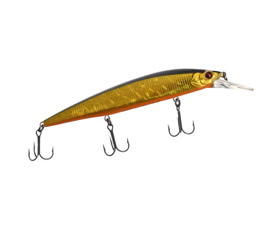 Воблер Flagman Robber-Minnow 132SP – воблер з нейтральною плавучістю із класу великих міноу, який розроблено для ловлі великої щуки. Приманка відрізняється від схожої на неї повільно спливаючої моделі Robber-Minnow 132MR-SF дещо меншою вагою та нейтральною плавучістю. Сильно витягнута форма з пласкими боками створює гарну аеродинаміку під час закидання й дає змогу досягти дуже привабливої гри. Принаду оснащено магнітною системою далекого закидання, що складається з кулі та магніту, який фіксує її в робочому стані. Під час закидання куля перекочується спеціальним каналом та зміщує центр тяжіння у хвіст приманки, завдяки чому політ воблера виходить далеким і точним. Що стосується гри приманки, Robber-Minnow 132SP – стовідсотковий джеркбейт, не позбавлений своєї гри на рівномірній проводці. Однак найкращі якості Flagman Robber-Minnow 132SP розкриває на ривковому проведенні. Проте ривки краще виконувати на кшталт різких ударів, чого можна досягти лише з досить жорстким вудлищем. За правильно підібраного проведення воблер широко й хаотично нишпорить у різні боки, часом розвертаючись на 180 градусів, а кожен його рух супроводжується привабливим ролінгом – згасаючим похитуванням приманки навколо своєї осі. Усі ці рухи приманки неймовірним чином діють на рибу та спонукають її до атаки. Flagman Robber-Minnow застосовують для ловлі щуки вздовж берегових звалів, очерету, латаття, а також на широких плесах із глибинами 2-3 метри. Найбільш результативні проведення – ривкове, Stop & Go, рівномірне. Модель оснащено трьома найгострішими трійниками, вона має виразне голографічне покриття та багату кольорову гаму.