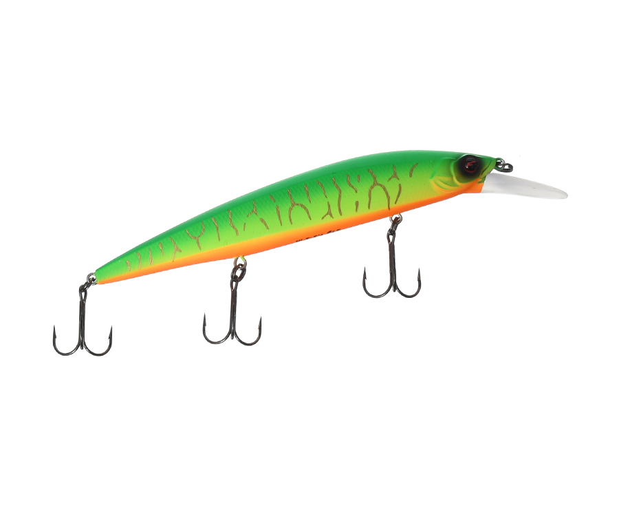 Воблер Flagman Robber-Minnow 132SP – воблер з нейтральною плавучістю із класу великих міноу, який розроблено для ловлі великої щуки. Приманка відрізняється від схожої на неї повільно спливаючої моделі Robber-Minnow 132MR-SF дещо меншою вагою та нейтральною плавучістю. Сильно витягнута форма з пласкими боками створює гарну аеродинаміку під час закидання й дає змогу досягти дуже привабливої гри. Принаду оснащено магнітною системою далекого закидання, що складається з кулі та магніту, який фіксує її в робочому стані. Під час закидання куля перекочується спеціальним каналом та зміщує центр тяжіння у хвіст приманки, завдяки чому політ воблера виходить далеким і точним. Що стосується гри приманки, Robber-Minnow 132SP – стовідсотковий джеркбейт, не позбавлений своєї гри на рівномірній проводці. Однак найкращі якості Flagman Robber-Minnow 132SP розкриває на ривковому проведенні. Проте ривки краще виконувати на кшталт різких ударів, чого можна досягти лише з досить жорстким вудлищем. За правильно підібраного проведення воблер широко й хаотично нишпорить у різні боки, часом розвертаючись на 180 градусів, а кожен його рух супроводжується привабливим ролінгом – згасаючим похитуванням приманки навколо своєї осі. Усі ці рухи приманки неймовірним чином діють на рибу та спонукають її до атаки. Flagman Robber-Minnow застосовують для ловлі щуки вздовж берегових звалів, очерету, латаття, а також на широких плесах із глибинами 2-3 метри. Найбільш результативні проведення – ривкове, Stop & Go, рівномірне. Модель оснащено трьома найгострішими трійниками, вона має виразне голографічне покриття та багату кольорову гаму.