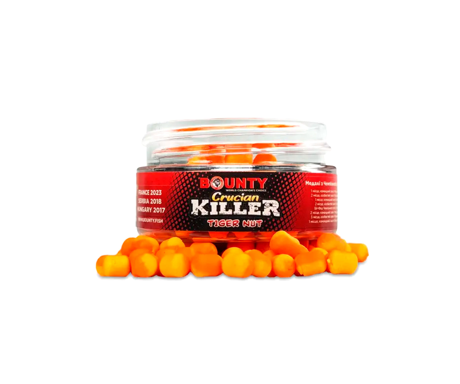 Бойл Bounty Wafters Crucian Killer — це міні-вафтерси розміром 4/6 мм з легкою плавучістю, призначені для лову карася з використанням невеликих гачків. Вони представлені в різних ароматах, включно з N-Butyric, Honey, Hemp, Caramel/Vanilla, Black Coffee і Asian Spices. Ці насадки були розроблені 2024 року для змагань, де виникла необхідність ефективно ловити карася. Продукція Bounty створена триразовими чемпіонами світу з коропового лову, що гарантує високу якість і ефективність.