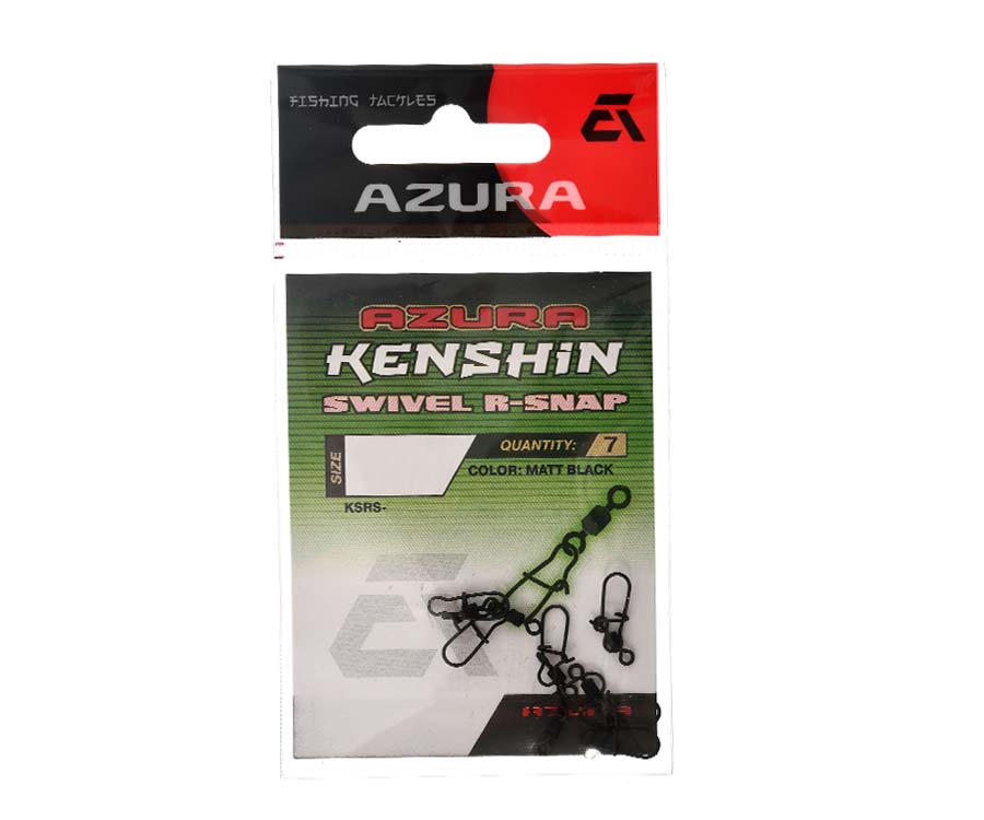 Застібка з вертлюгом Azura Kenshin Swivel R-Snap – надійна та міцна застібка-американка в поєднанні з класичним вертлюгом, які виготовлено зі сталевого дроту найвищої якості. Azura Kenshin Swivel R-Snap – важливий елемент монтажу для економії часу ловлі в разі заміни приманки або оснастки. Запобігає перекручуванню жилки під час ловлі активними та обертовими приманками, особливо на течії. Ідеально поєднується з джиговими приманками, блешнями, воблерами тощо. Також Azura Kenshin Swivel R-Snap чудово підійдуть для виготовлення різноманітних риболовних оснасток і монтажів як у лайтовій ловлі, так і у важкому джигінгу та тролінгу. Доступні в широкому спектрі розмірів із різним розривним навантаженням. Колір захисного покриття: Matt Black.