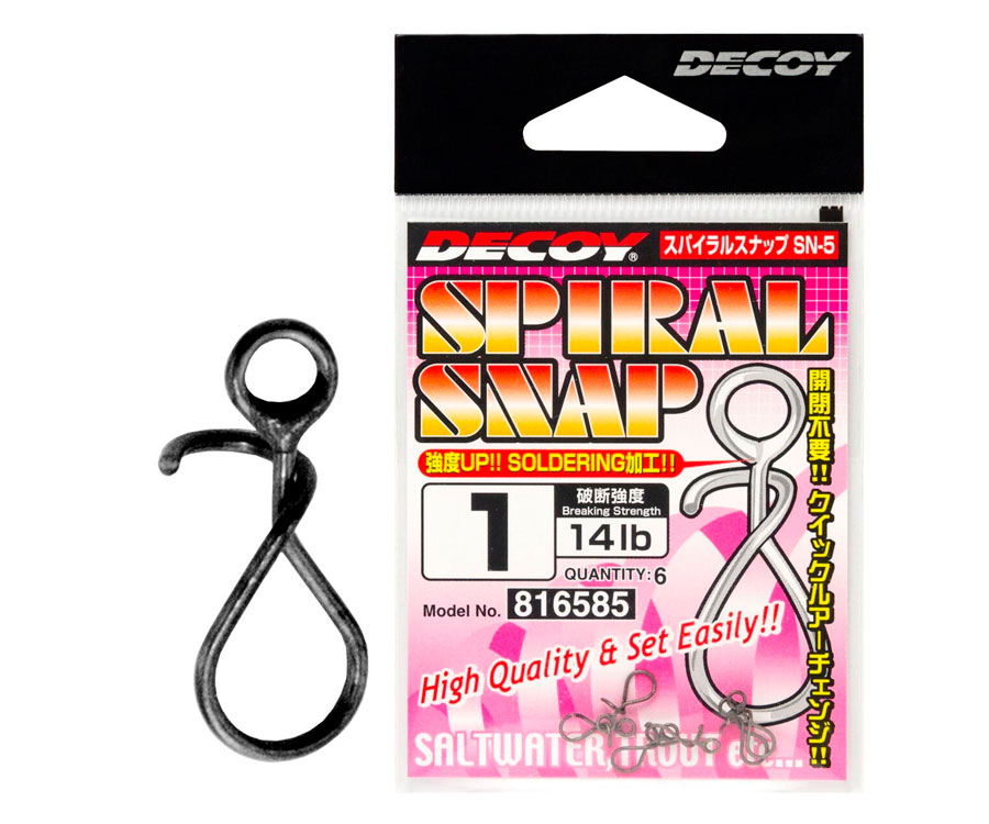 Застібка Decoy SN-5 Spiral Snap з пропаяною петлею для прив'язування волосіні застосовується для оперативної зміни приманки. Використовується висококласна пружинна сталь, тому фіксація приманки на такій застібці не викликає жодних питань. Підходить для прісної та солоної води та для приманок всіх типів від мікро коливань до воблерів.