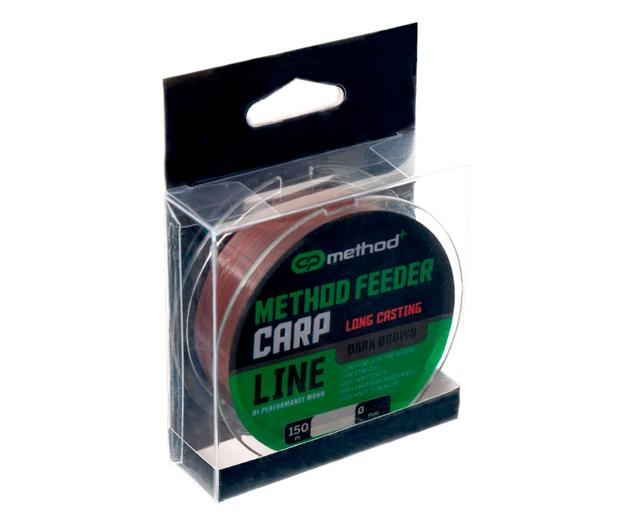 Жилка CP Method+ Method Feeder Carp Line – монофільна жилка нового покоління, яку виготовлено з використанням передових технологій із високоякісних сучасних полімерів. Її розроблено спеціально для застосування в метод-фідерній ловлі в ролі основної жилки. Відрізняється виключно гладкою поверхнею, достатньою жорсткістю і мінімальною розтяжністю, чим забезпечує виконання далеких точних закидань і високу чутливість фідерної снасті. До переваг CP Method+ Method Feeder Carp Line також можна додати непомітність для риби, підвищену стійкість до абразивних впливів, високу міцність, зокрема й на вузлах, мінімальний коефіцієнт пам'яті. Спеціальне забарвлення Dark Brown чудово маскує її на тлі дна водойми. Метод-фідерні жилки CP Method+ Method Feeder Carp Line випускають у найбільш популярних діаметрах та розмотуванні 150 і 300 м.